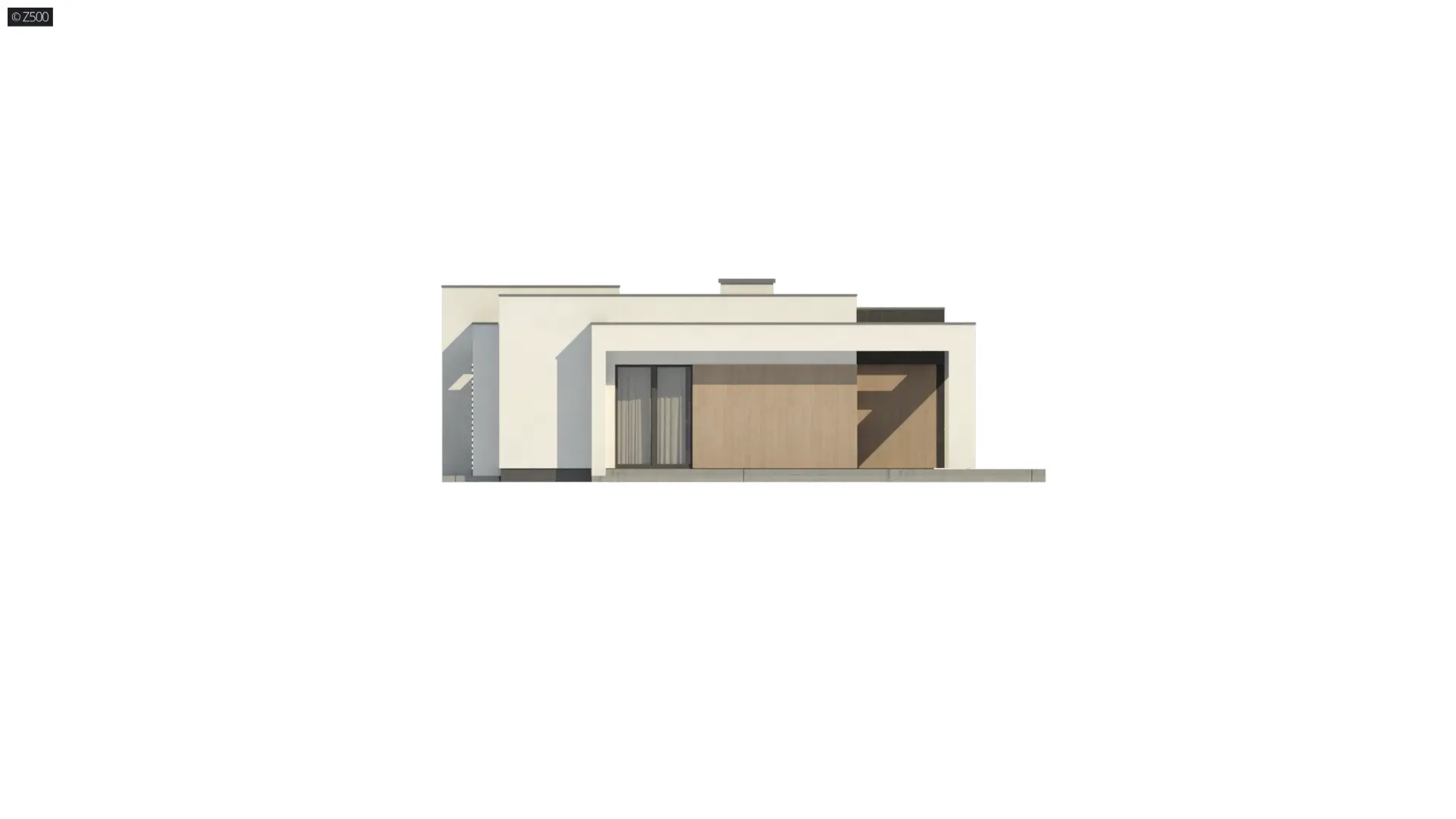Zx77 to mały nowoczesny dom z płaskim dachem, zadaszonym tarasem, przesuwnymi panelami i ciepłą kolorystyką elewacji. Dzięki niedużej powierzchni znakomicie nadaje się na projekt dla młodych małżeństw.