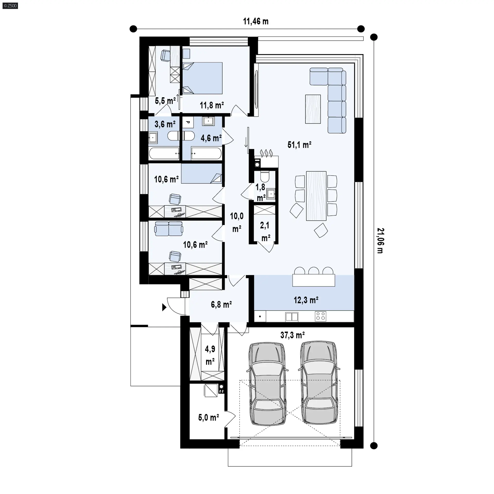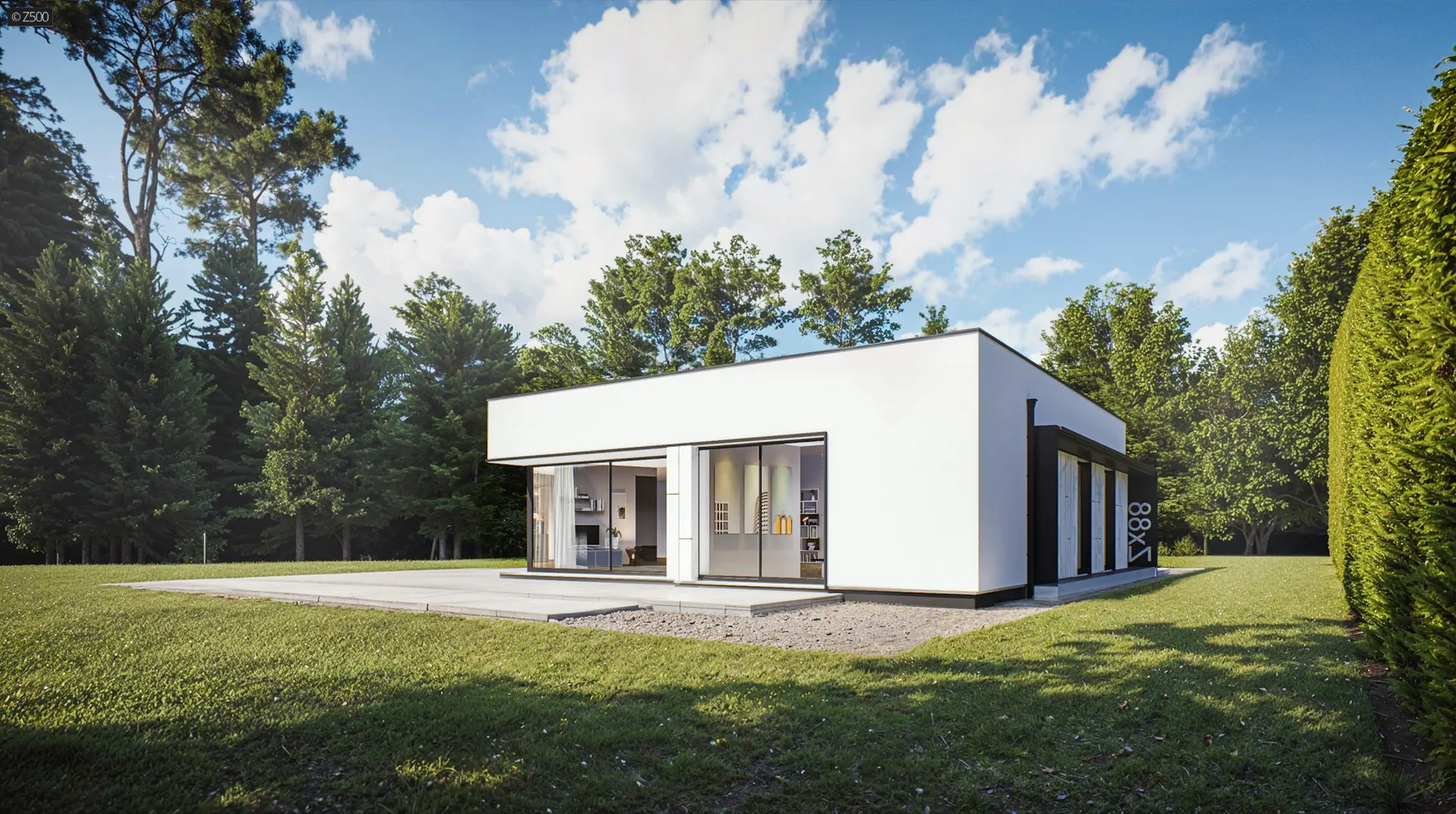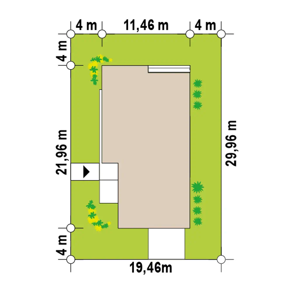 Projekt domu Zx88 B to wariant projektu zx88 z uproszczoną bryłą. W układzie przewidziano 3 sypialnie, 3 łazienki, salon 51,13 m², garaż na 2 auta. Minimalna działka: 19,46 m × 29,06 m.
