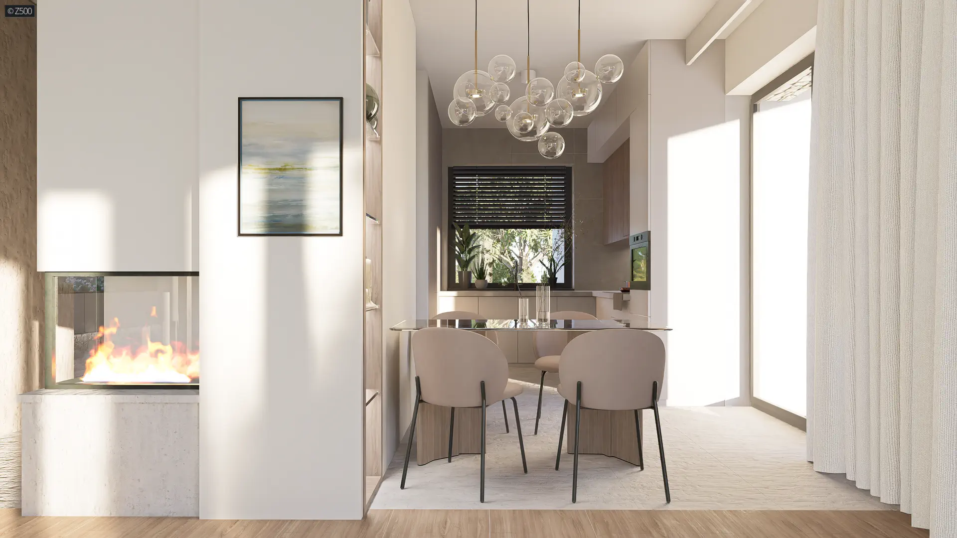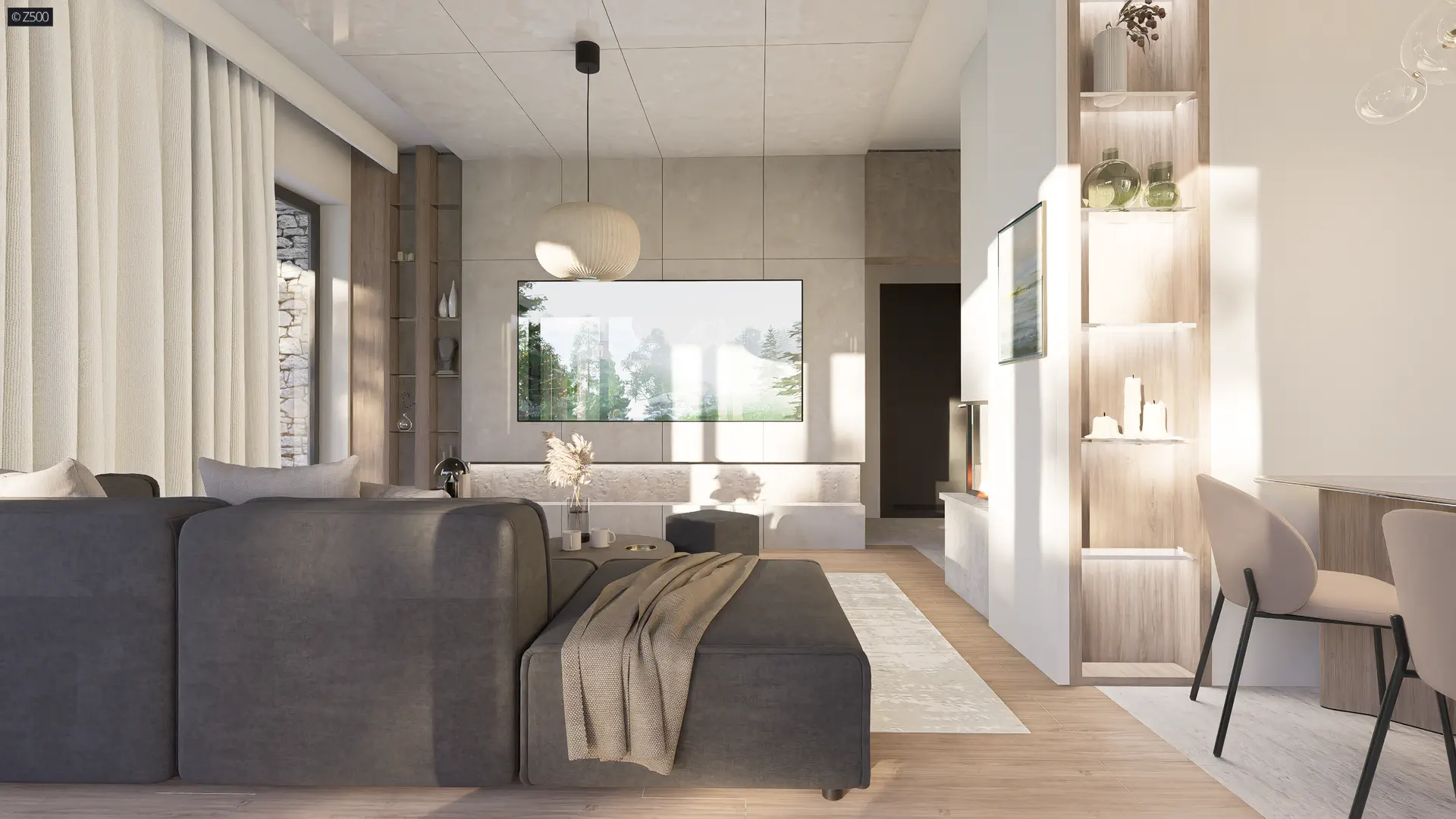 Lewa strona domu to część dzienna, reprezentacyjna, aneks kuchenny otwarty na salon i jadalnię. Od frontu umieszczono ustawną kuchnię, zaś po środku potrzebną spiżarnię oraz ciepły kominek od strony salonu. W części dziennej zastosowano duże przeszklenia, które ciągną się od jadalni do końca salonu.