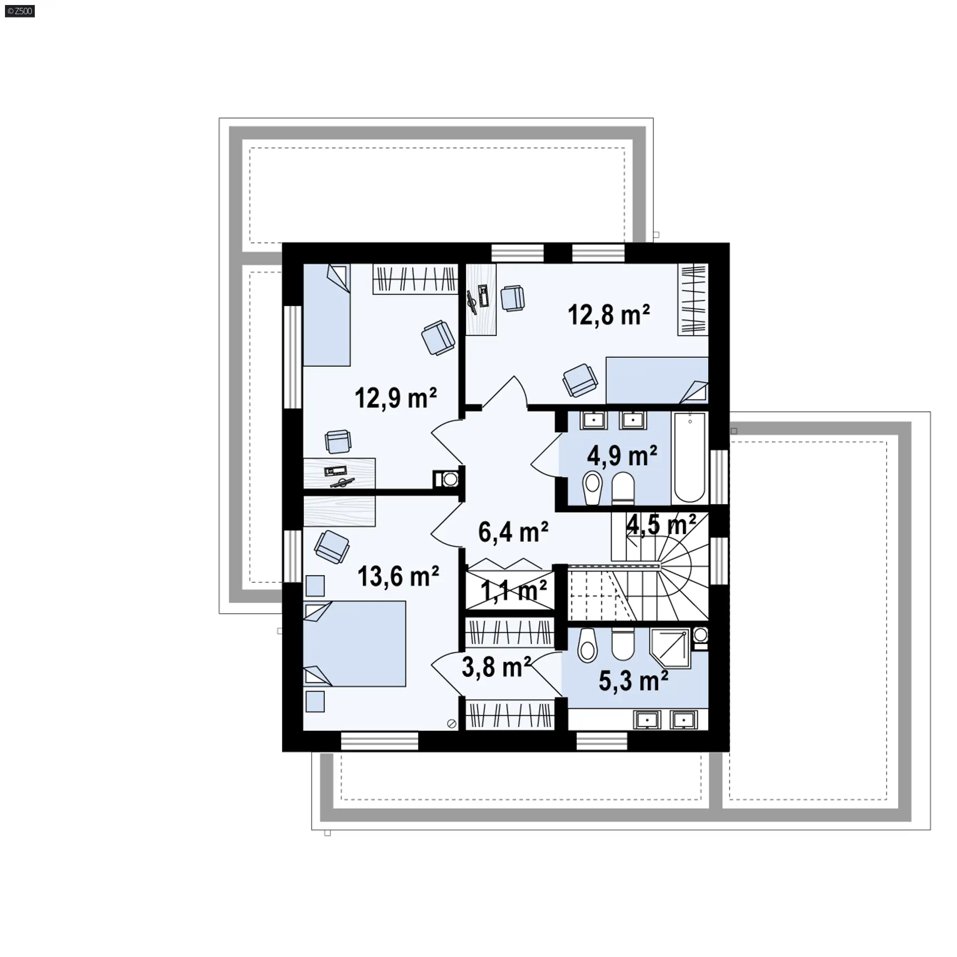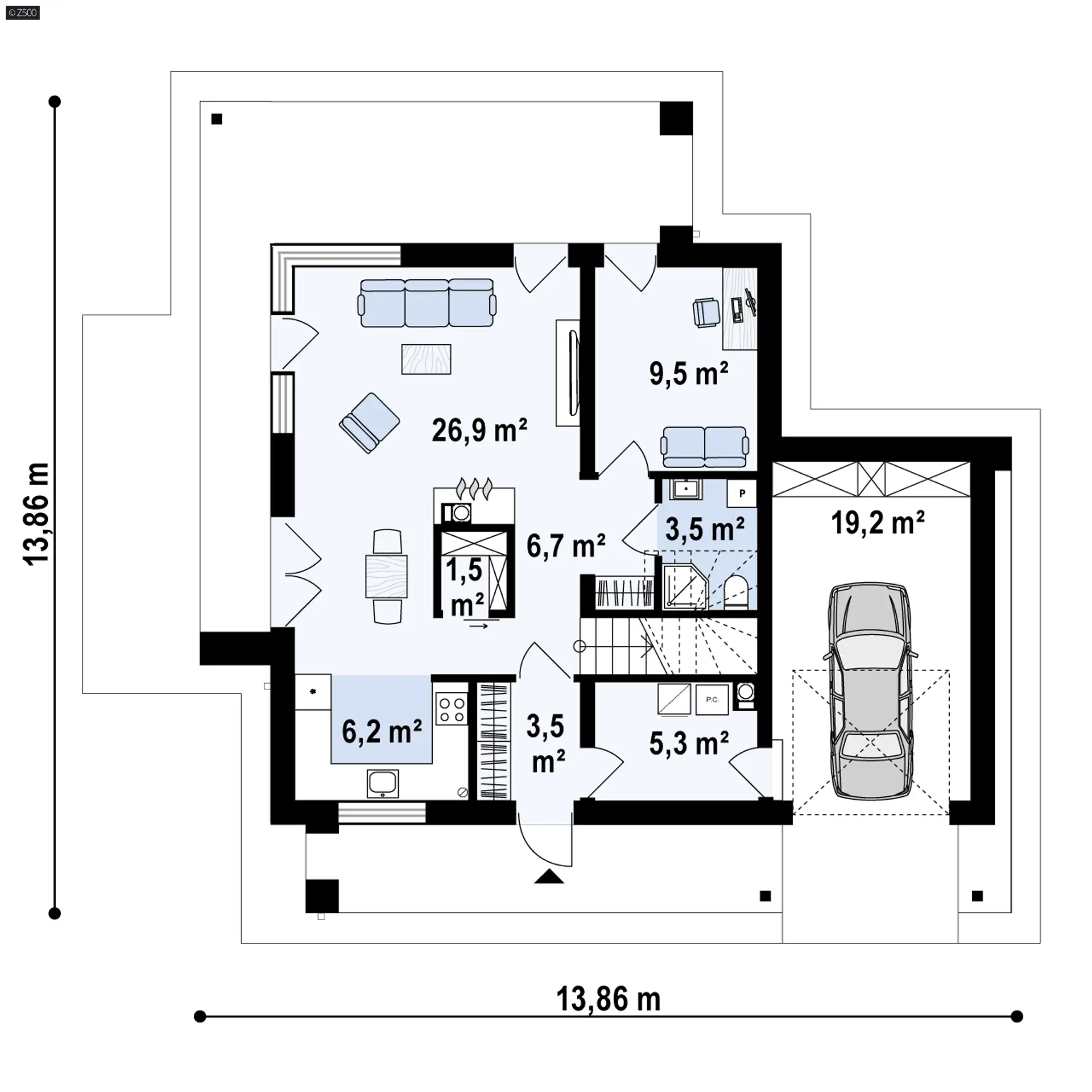 Dom Zx92 GP dedykowany jest dla rodziny z dwojgiem lub trojgiem dzieci – pamiętajmy, na parterze jest dodatkowy pokój, który niekoniecznie musi być gabinetem. Atutem proponowanego państwu projektu jest fakt, iż na 120m2 ulokowano 5 pokoi, z których jeden to piękny salon, a drugi to master bedroom.