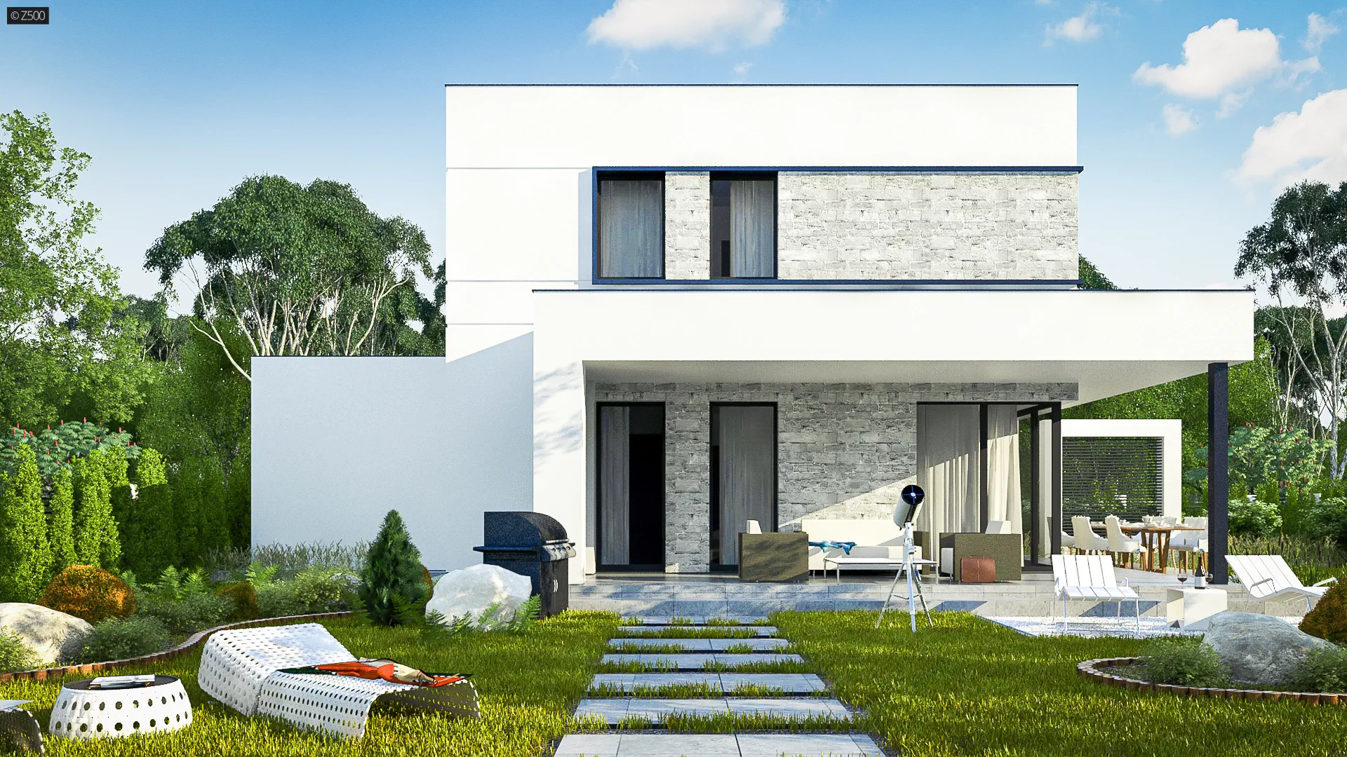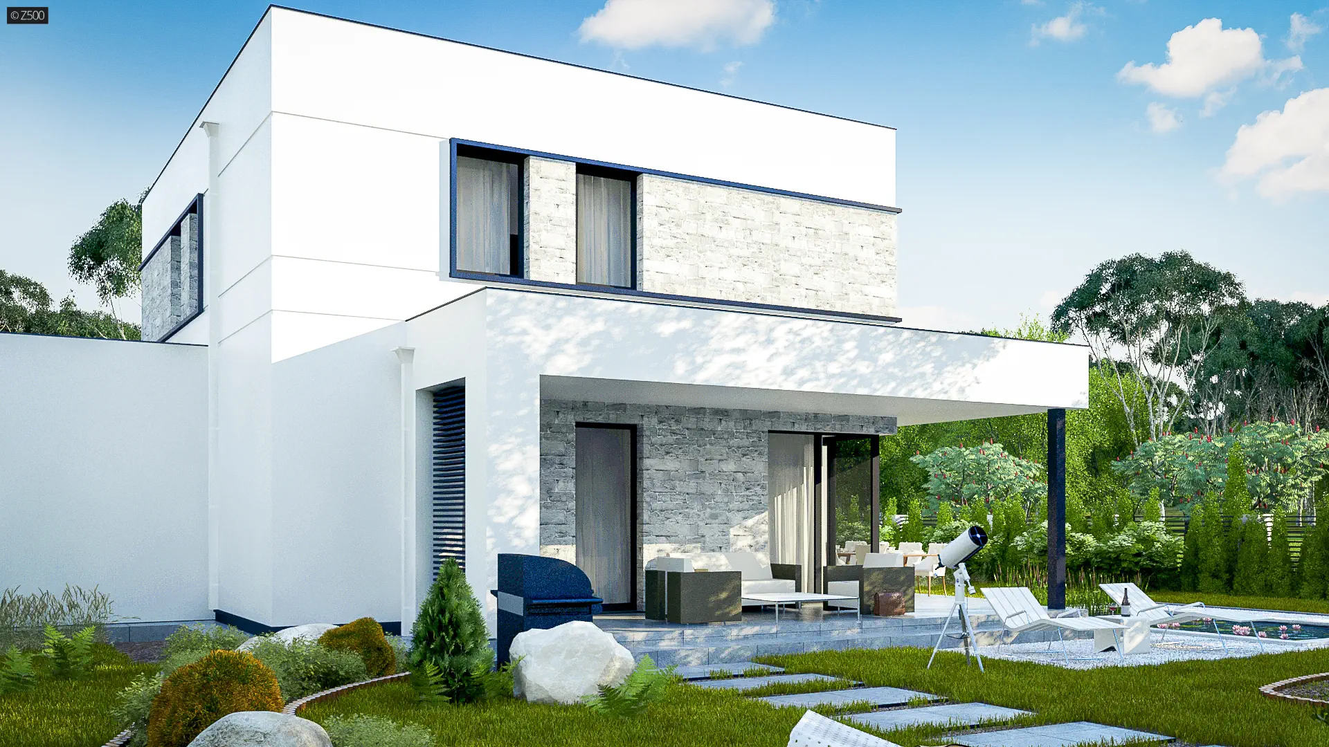 Elewacja to biały tynk z poziomymi, delikatnymi boniowaniami i ułożonym szarym kamieniem. Dodatkowo doprojektowano proste zadaszenia nad wejściem oraz nad tarasem.