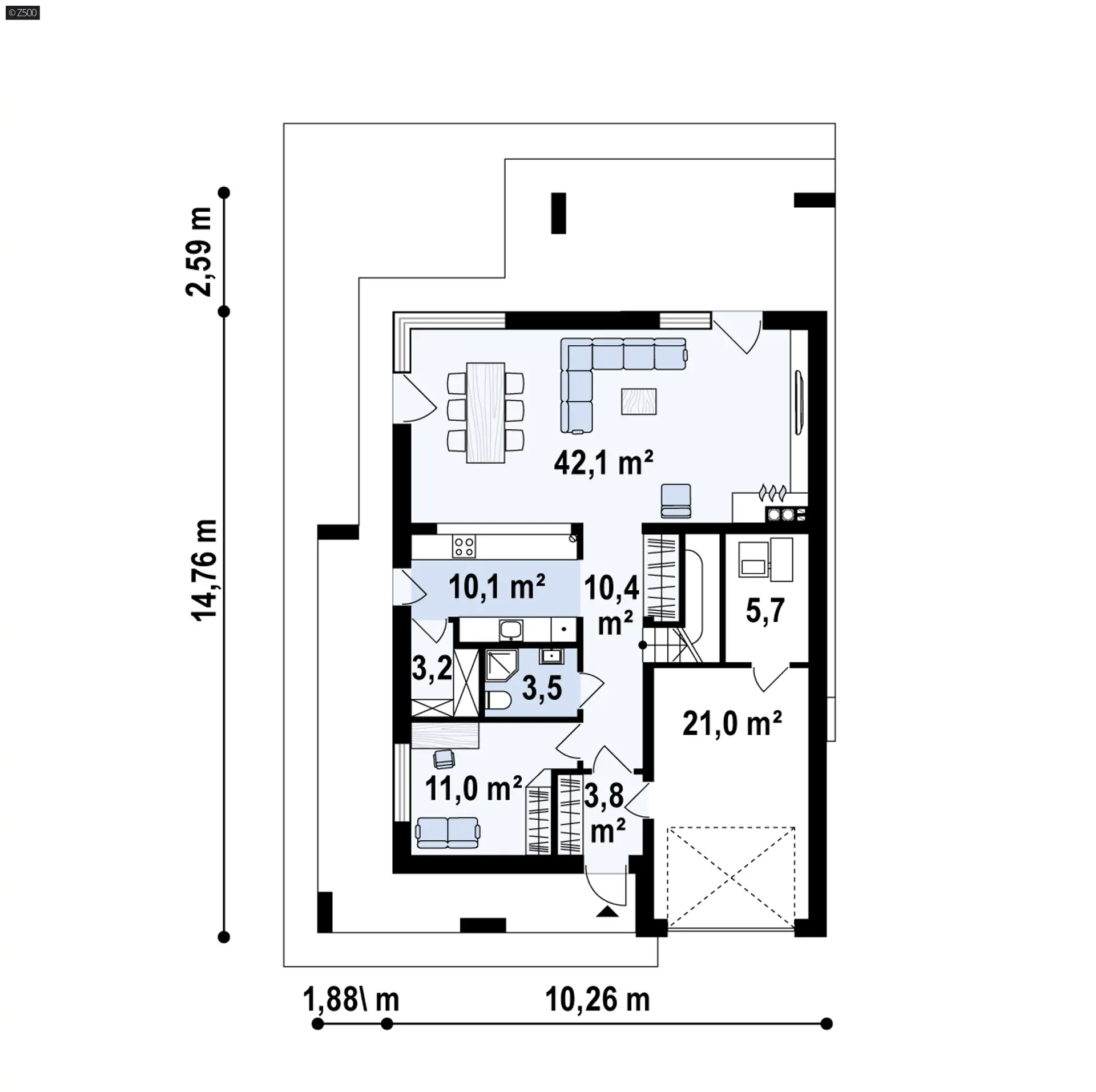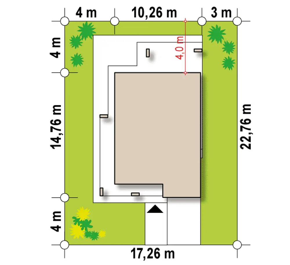 Budynek jest piętrowy z płaskim dachem i jednostanowiskowym garażem. Zaprojektowano jeden komin, co bezwzględnie stanowi atut. Te ok. 150m.2 powierzchni dedykowanej jest dla osób lubujących się w prostocie.